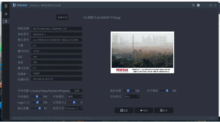 Picborder采用Python编写,Ui使用的是Github上开源的UI:基于Pyside6的PyoneDark。软件的功能只有一个,读取照片的EXIF信息,然后给照片加上包含拍摄信息的空白边框。
